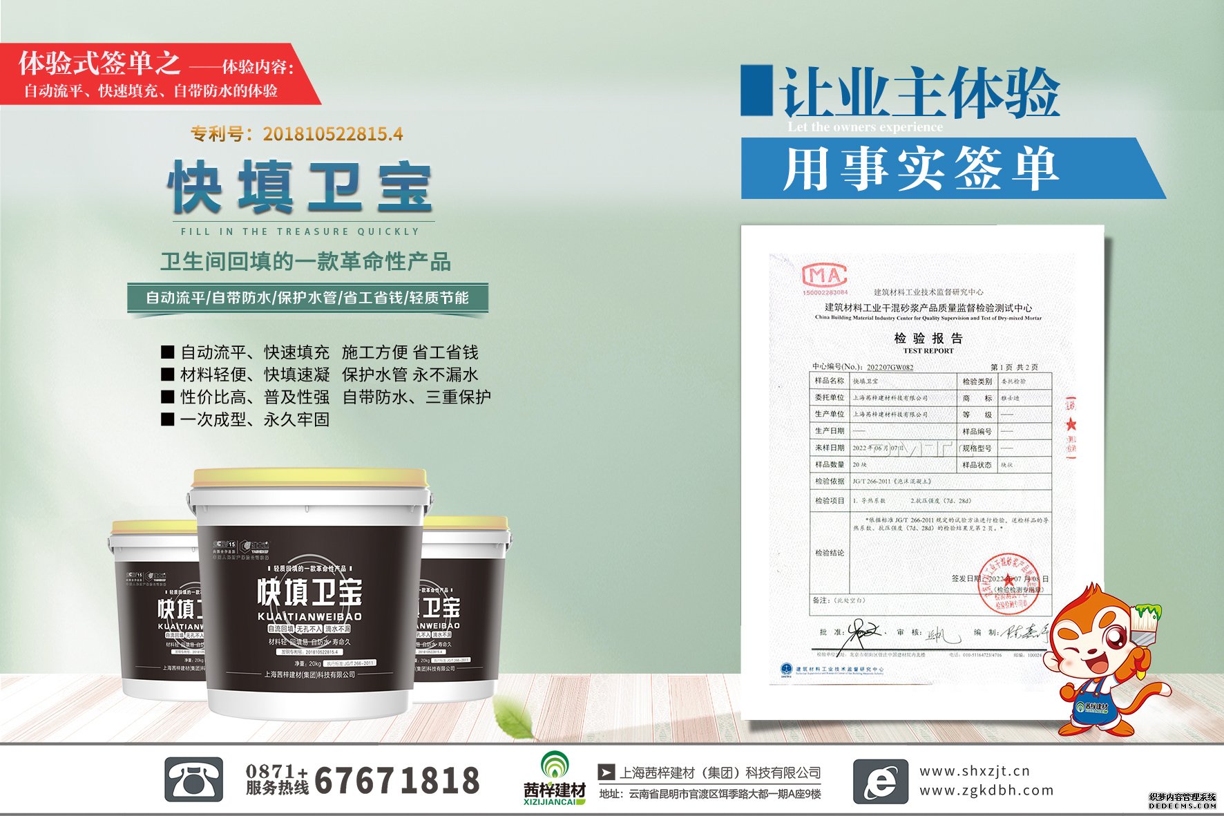 1. 施工方便 省工省钱:一个立方施工1.2个小时,三天后即可粘贴瓷砖;传统施工从做防水到回填到水泥砂浆找平到面层做防水最少12天时间,相比而言节省了9天工期;